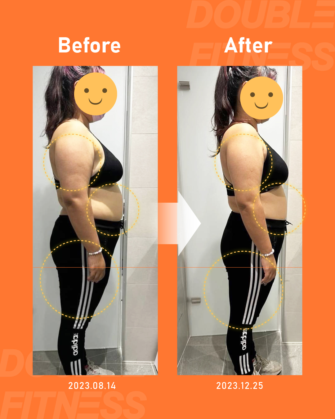 學員一開始被高內臟脂肪、打球肩膀痛、還有膝蓋超伸困擾著,